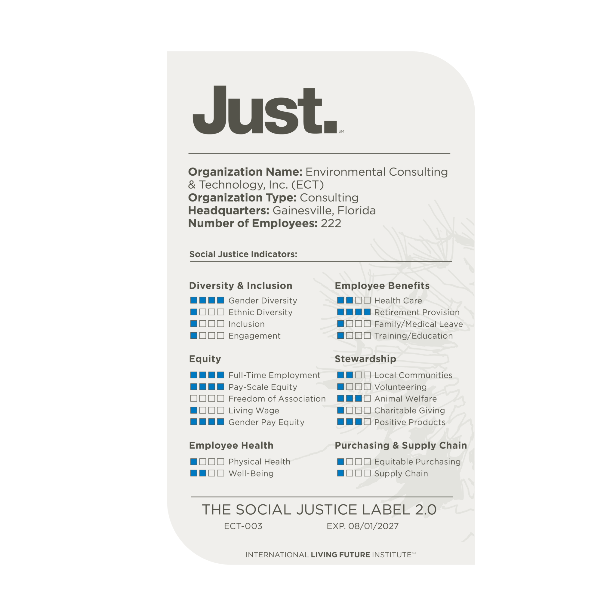 ECT is a JUST 2.0 organization, demonstrating our commitment to social equity and employee engagement. Sponsored by the International Living Future Institute, ECT was introduced to and obtained the JUST 2.0 label in 2021 as part of our efforts on a Living Building Challenge project.